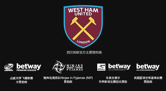 作为一个标志性的国际品牌,赞助西汉姆足球俱乐部,德甲联赛球队和西班牙西甲联赛球队,Betway必威非常有荣欣能成为西汉姆的官方合作伙伴。Betway必威的商标可以在西汉姆的比赛球衣,联系球衣。官方网站与伦敦奥林匹克体育场上。